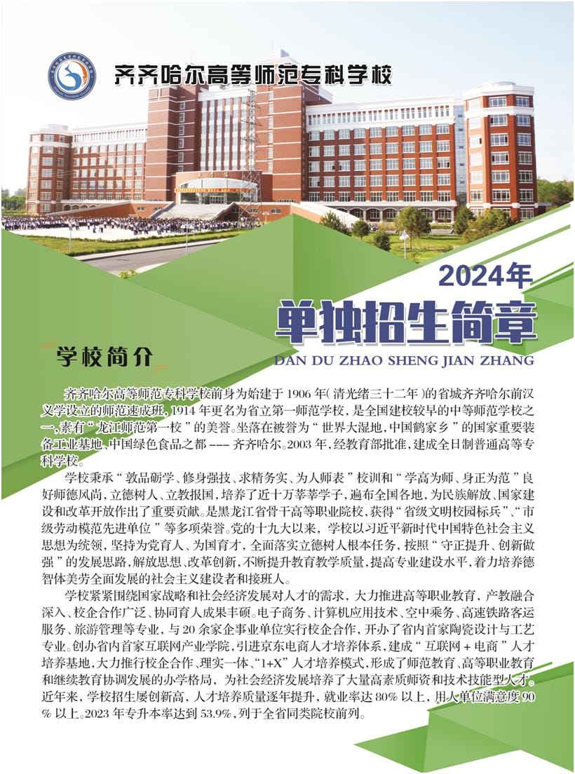 考生登录黑龙江省招生考试信息港(https://www.lzk.hl.cn)、黑龙江省招生考试院(https://www.hljea.org.cn) ,进入“网报中心”,选择“黑龙江省2024年高职院校单独招生志愿填报入口”进行志愿填报。选择“齐齐哈尔高等师范专科学校”及专业志愿即可,并填选“是否服从院校内专业调剂”。